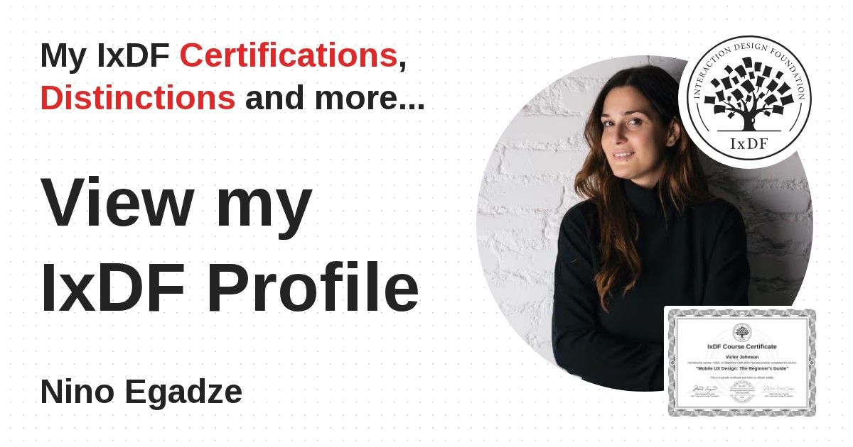 IxDF Course Certificates are awarded to Nino Egadze in formal recognition of their coursework surpassing the rigorous benchmarks of exceptional performance established by the IxDF Educational Codex.