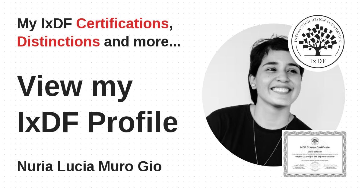 Distinctions are conferred upon Nuria Lucia Muro Gio in formal recognition of their notable achievements and contributions, as stipulated by the IxDF Educational Codex.