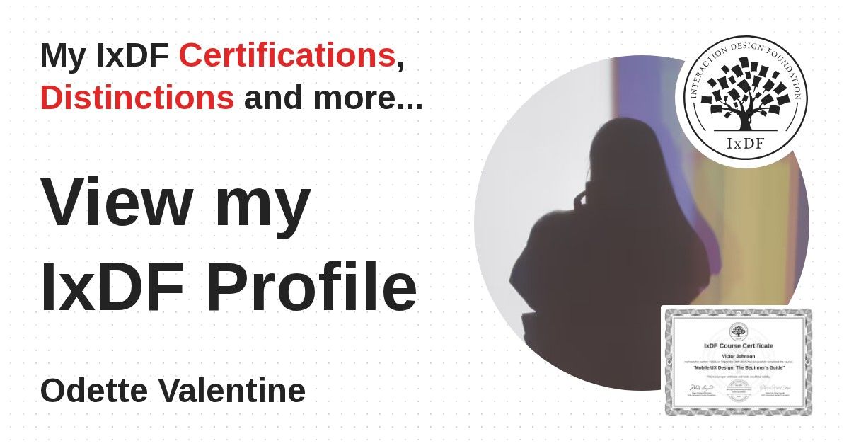 IxDF Course Certificates are awarded to Odette Valentine in formal recognition of their coursework surpassing the rigorous benchmarks of exceptional performance established by the IxDF Educational Codex.