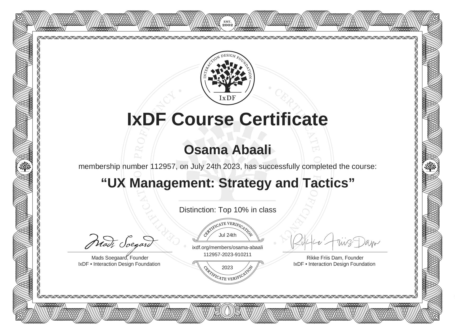 IxDF Course Certificates are awarded to Osama Abaali in formal recognition of their coursework surpassing the rigorous benchmarks of exceptional performance established by the IxDF Educational Codex.