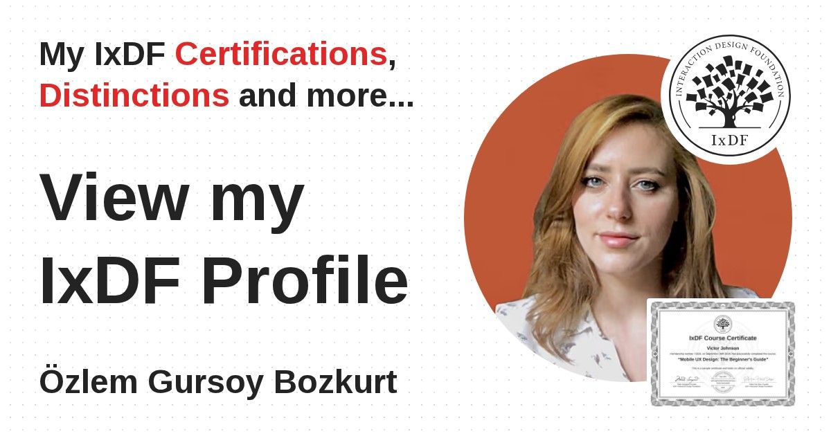 IxDF Course Certificates are awarded to Özlem Gursoy Bozkurt in formal recognition of their coursework surpassing the rigorous benchmarks of exceptional performance established by the IxDF Educational Codex.