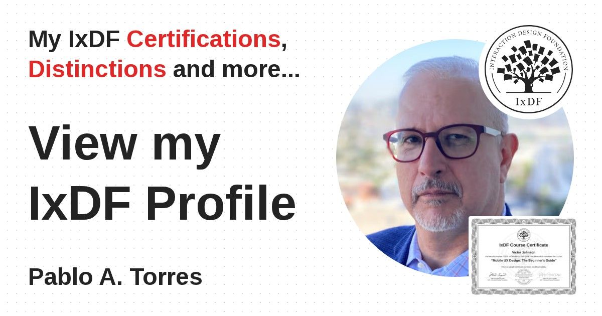 IxDF Course Certificates are awarded to Pablo A. Torres in formal recognition of their coursework surpassing the rigorous benchmarks of exceptional performance established by the IxDF Educational Codex.