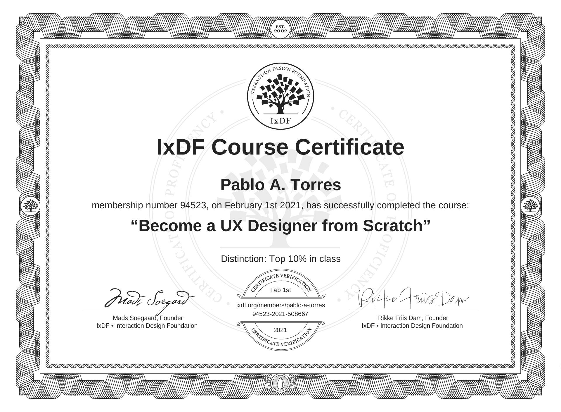 IxDF Course Certificate awarded to Pablo A. Torres for completing the "Become a UX Designer from Scratch" course