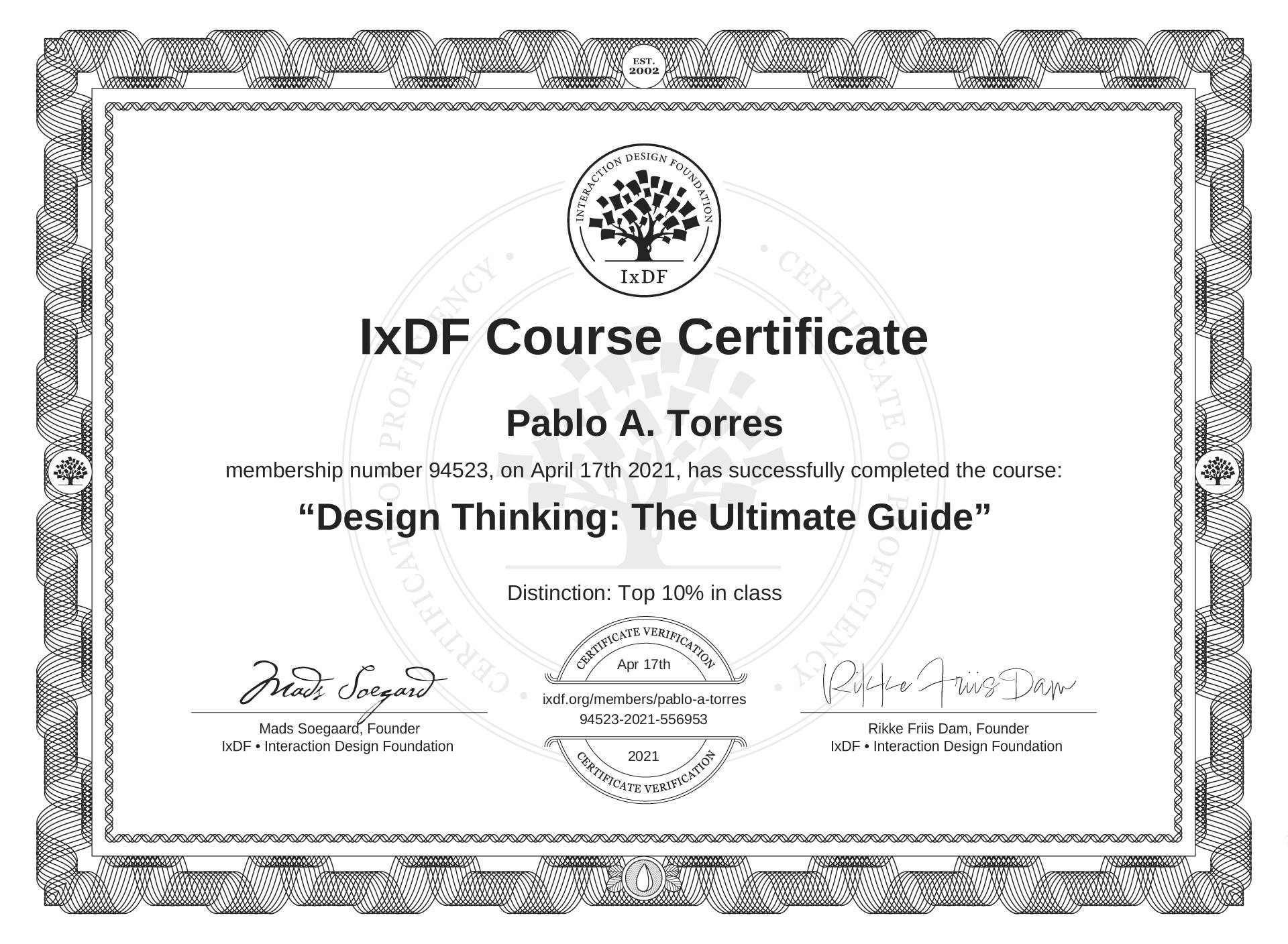IxDF Course Certificates are awarded to Pablo A. Torres in formal recognition of their coursework surpassing the rigorous benchmarks of exceptional performance established by the IxDF Educational Codex.