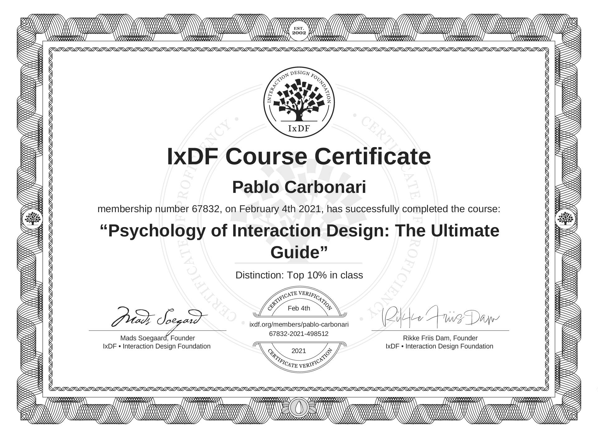 Pablo Carbonari's Course Certificate: Psychology of Interaction Design: The Ultimate Guide