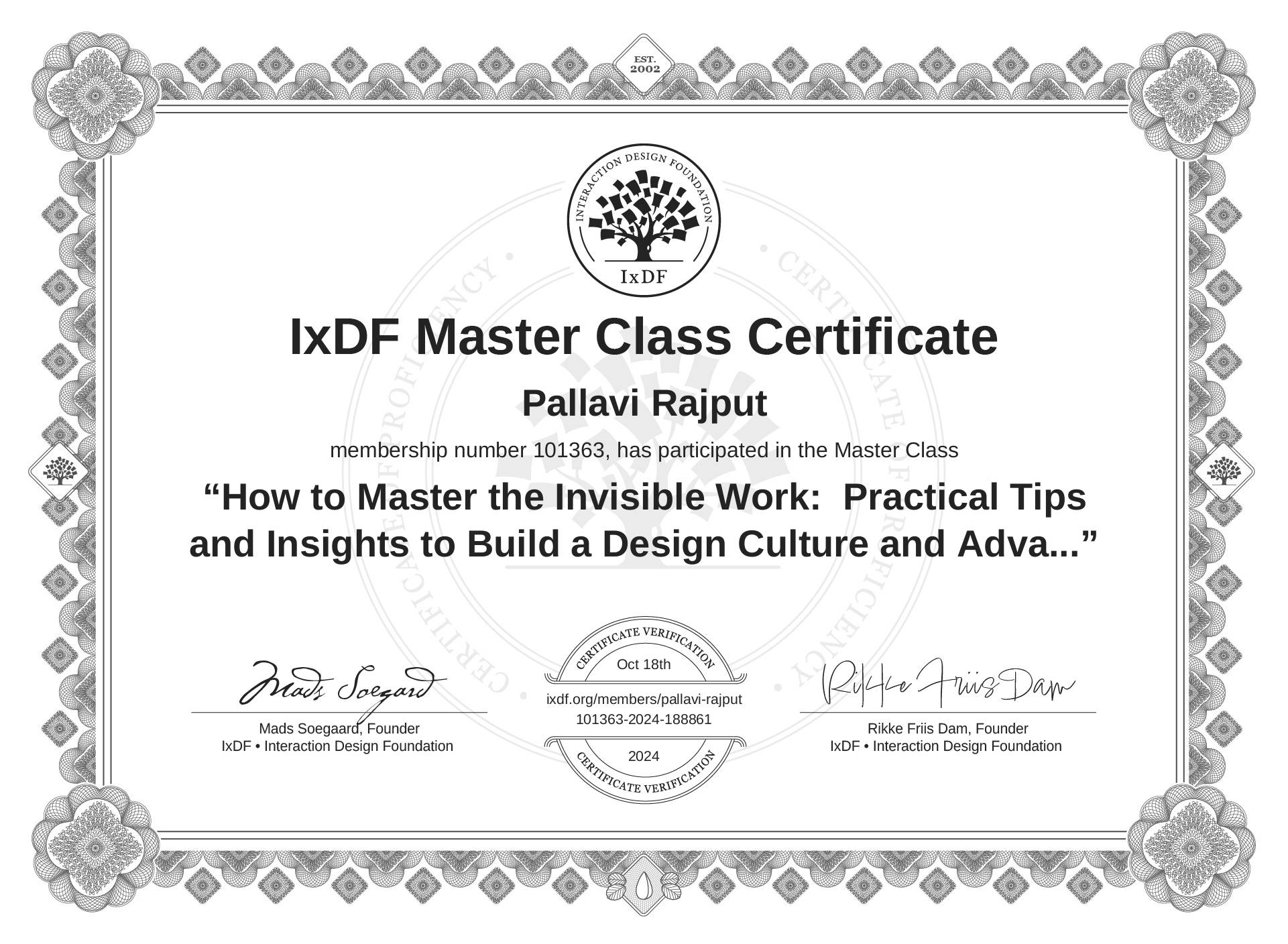 Pallavi Rajput's Masterclass Certificate: How to Master the Invisible Work: Practical Tips and Insights to Build a Design Culture and Advance Your Career