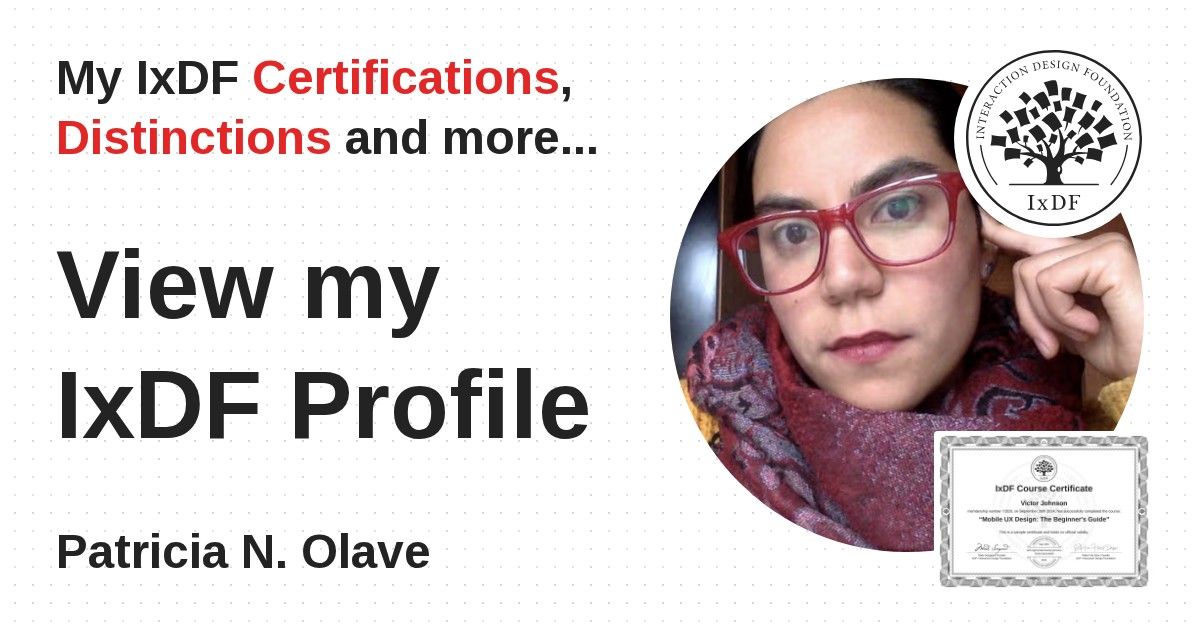 IxDF Course Certificates are awarded to Patricia N. Olave in formal recognition of their coursework surpassing the rigorous benchmarks of exceptional performance established by the IxDF Educational Codex.