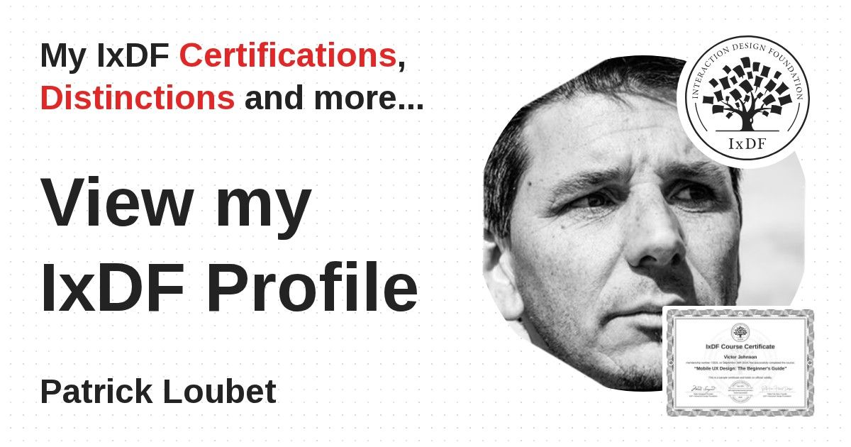 IxDF Course Certificates are awarded to Patrick Loubet in formal recognition of their coursework surpassing the rigorous benchmarks of exceptional performance established by the IxDF Educational Codex.