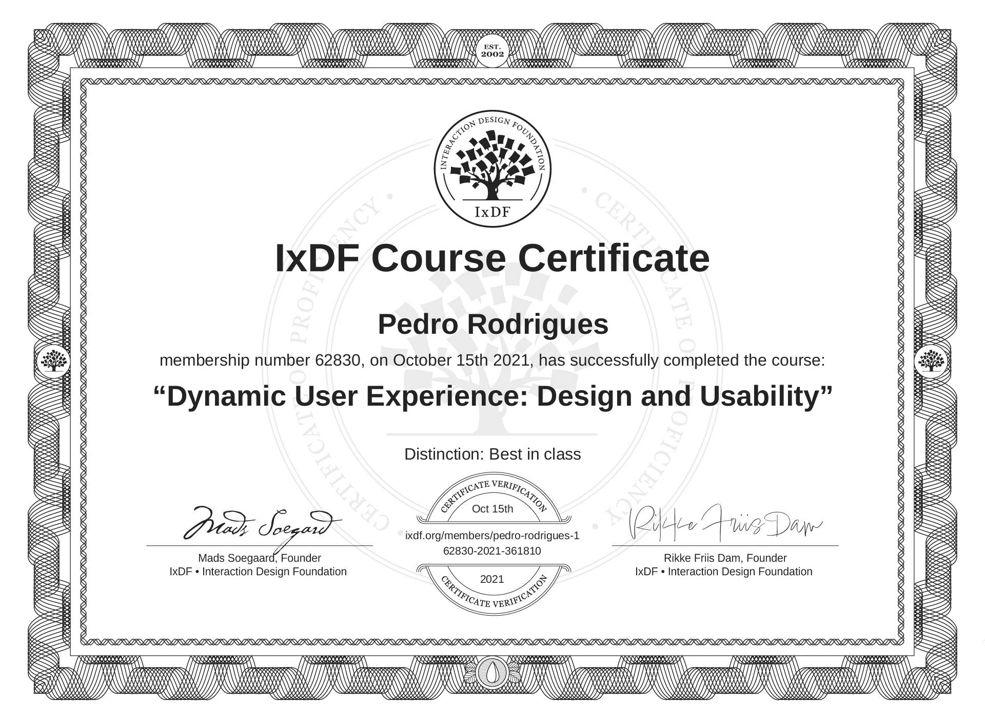 The IxDF Course Certificate (ID #22c37568-edb0-45b5-b4fc-dca784cfb1c1) above is awarded to Pedro Rodrigues with a Best in Class Distinction in formal recognition of their coursework surpassing the rigorous benchmarks of exceptional performance established by the IxDF Educational Codex. View Course Curriculum.