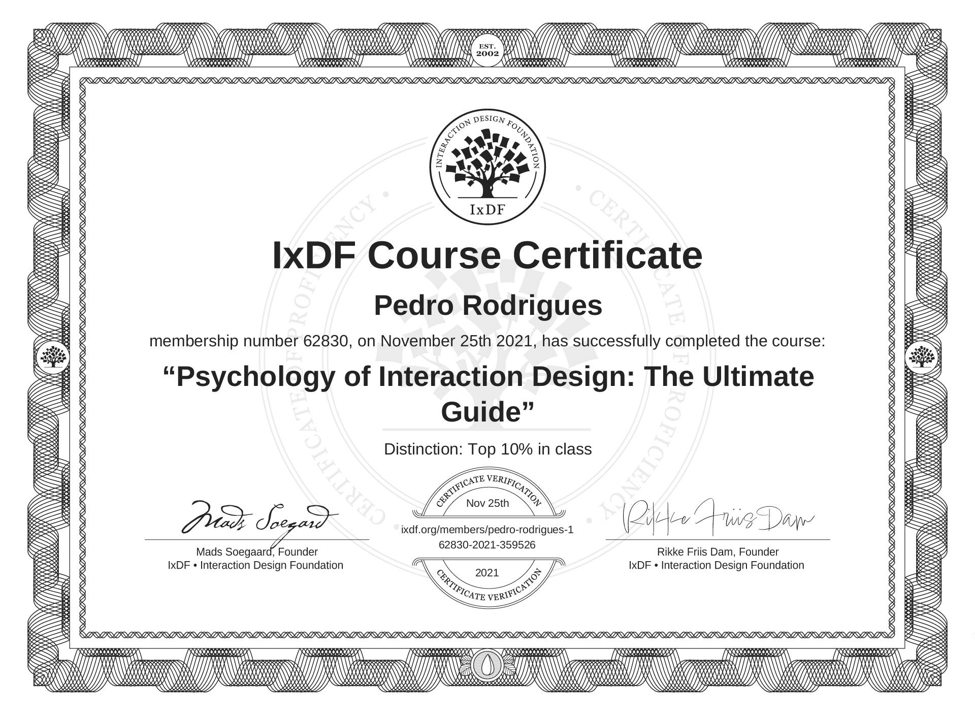 The IxDF Course Certificate (ID #f8542f60-ba2a-4d67-9881-cba1b4d22f49) above is awarded to Pedro Rodrigues with a Top 10% Distinction in formal recognition of their coursework surpassing the rigorous benchmarks of exceptional performance established by the IxDF Educational Codex. View Course Curriculum.
