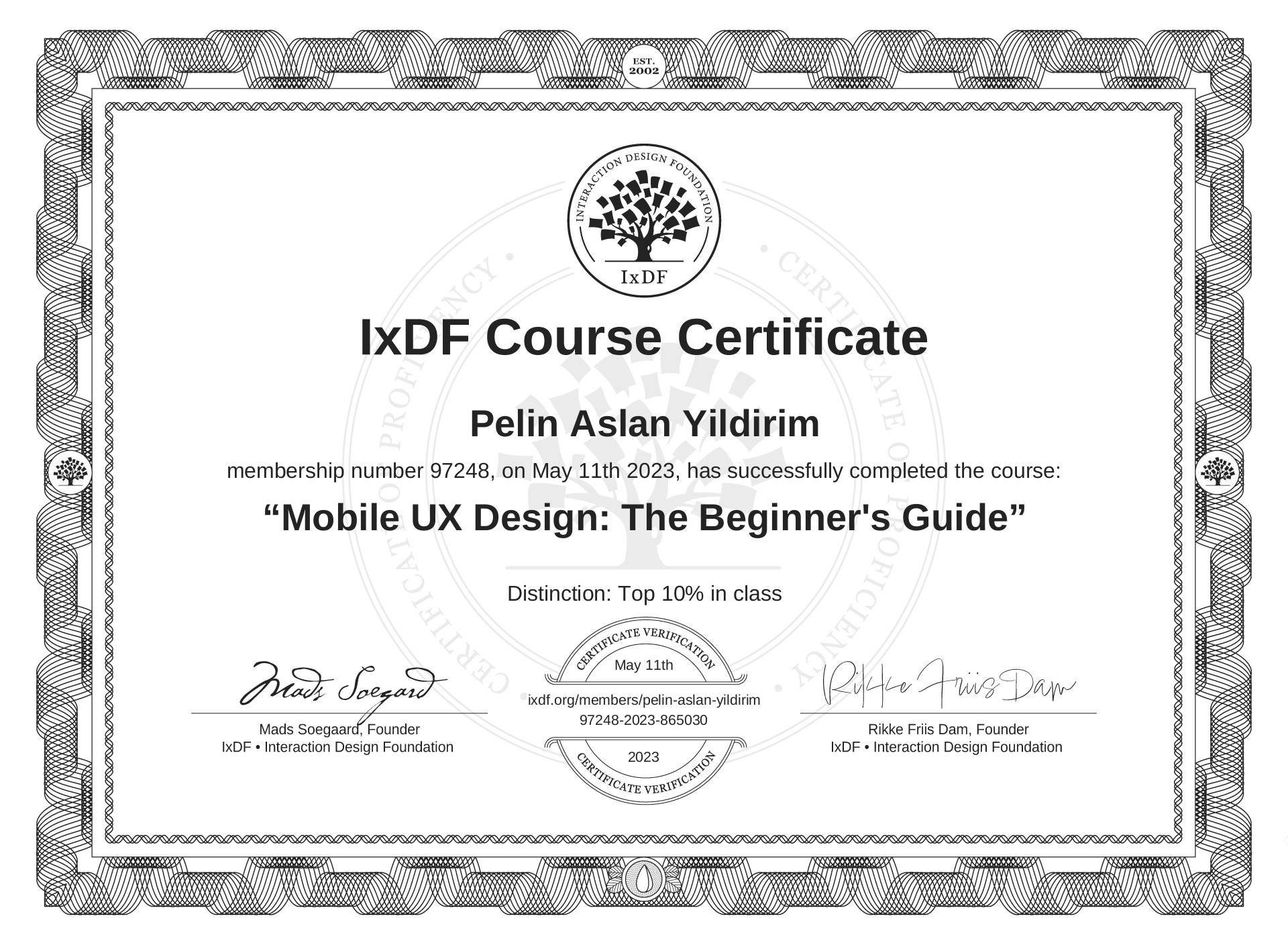The IxDF Course Certificate (ID #34709a2f-14bd-4865-a02a-3a30487e6119) above is awarded to Pelin Aslan Yıldırım