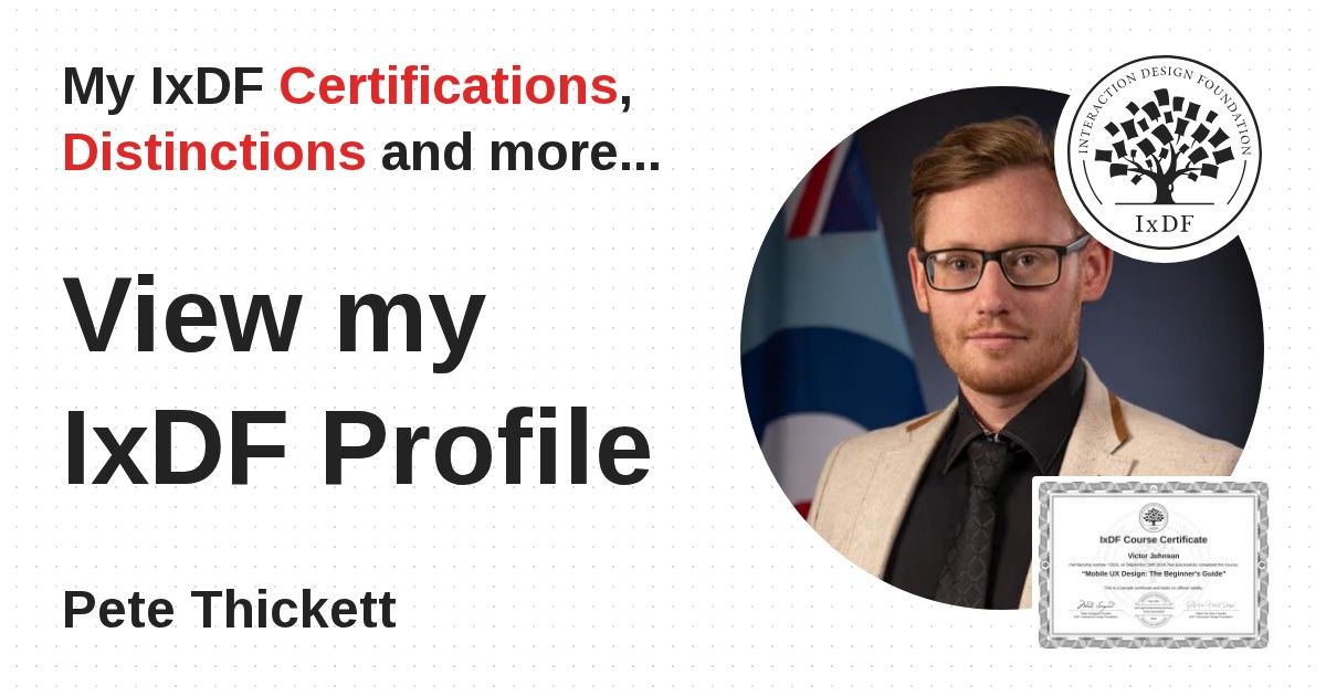 Distinctions are conferred upon Pete Thickett in formal recognition of their notable achievements and contributions, as stipulated by the IxDF Educational Codex.