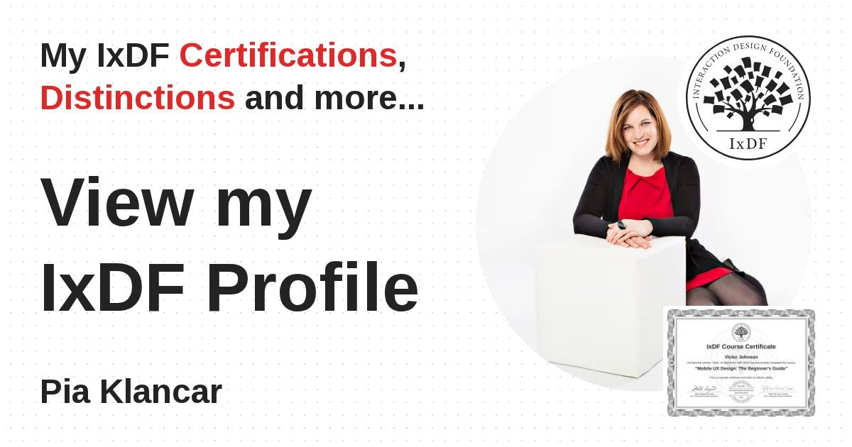 IxDF Course Certificates are awarded to Pia Klancar in formal recognition of their coursework surpassing the rigorous benchmarks of exceptional performance established by the IxDF Educational Codex.