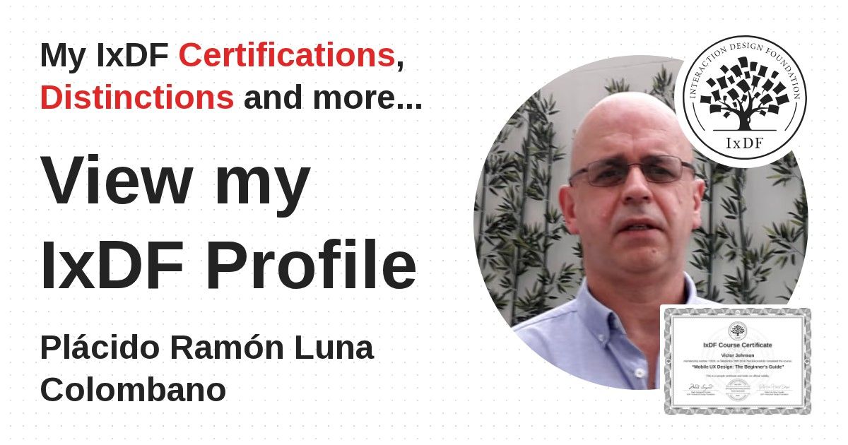 IxDF Course Certificates are awarded to Plácido Ramón Luna Colombano in formal recognition of their coursework surpassing the rigorous benchmarks of exceptional performance established by the IxDF Educational Codex.
