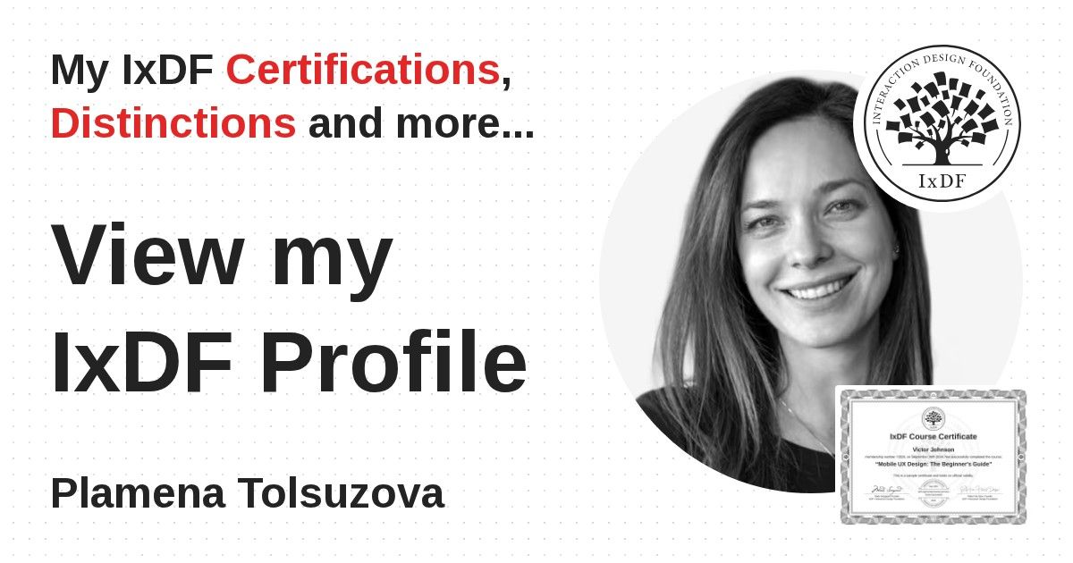 IxDF Course Certificates are awarded to Plamena Tolsuzova in formal recognition of their coursework surpassing the rigorous benchmarks of exceptional performance established by the IxDF Educational Codex.
