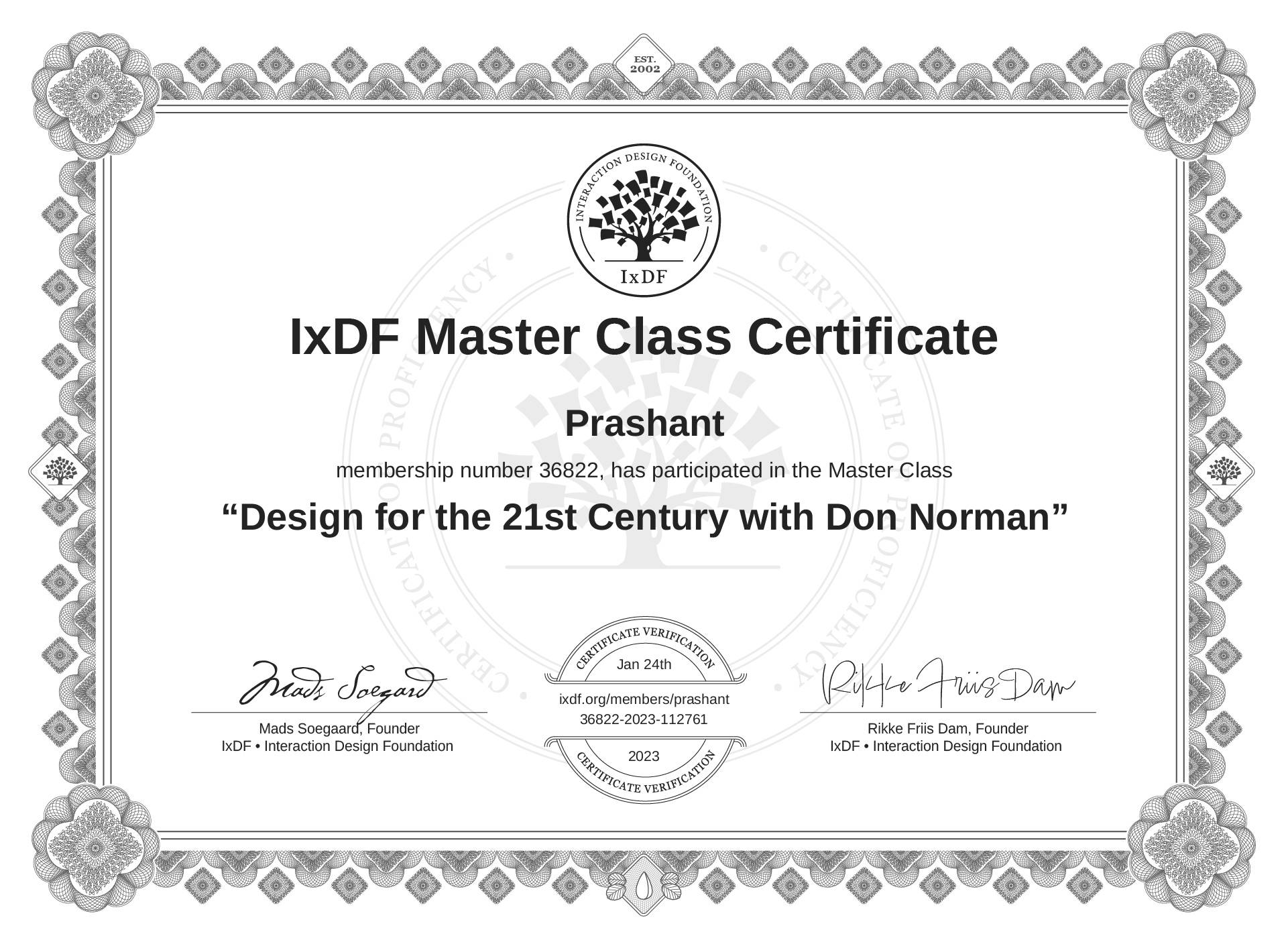 The IxDF Master Class Certificate (ID #mcc_cb9658c77d6945d79a6b8fd9127afc63) above is awarded to Prashant in formal recognition of their participation in the Master Class Design for the 21st Century with Don Norman .