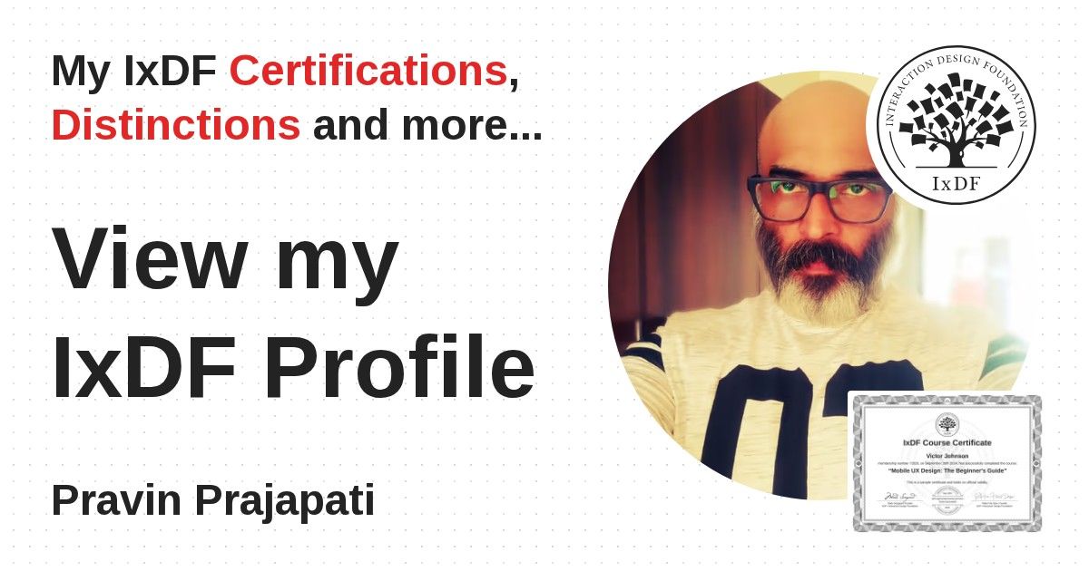 IxDF Course Certificates are awarded to Pravin Prajapati in formal recognition of their coursework surpassing the rigorous benchmarks of exceptional performance established by the IxDF Educational Codex.