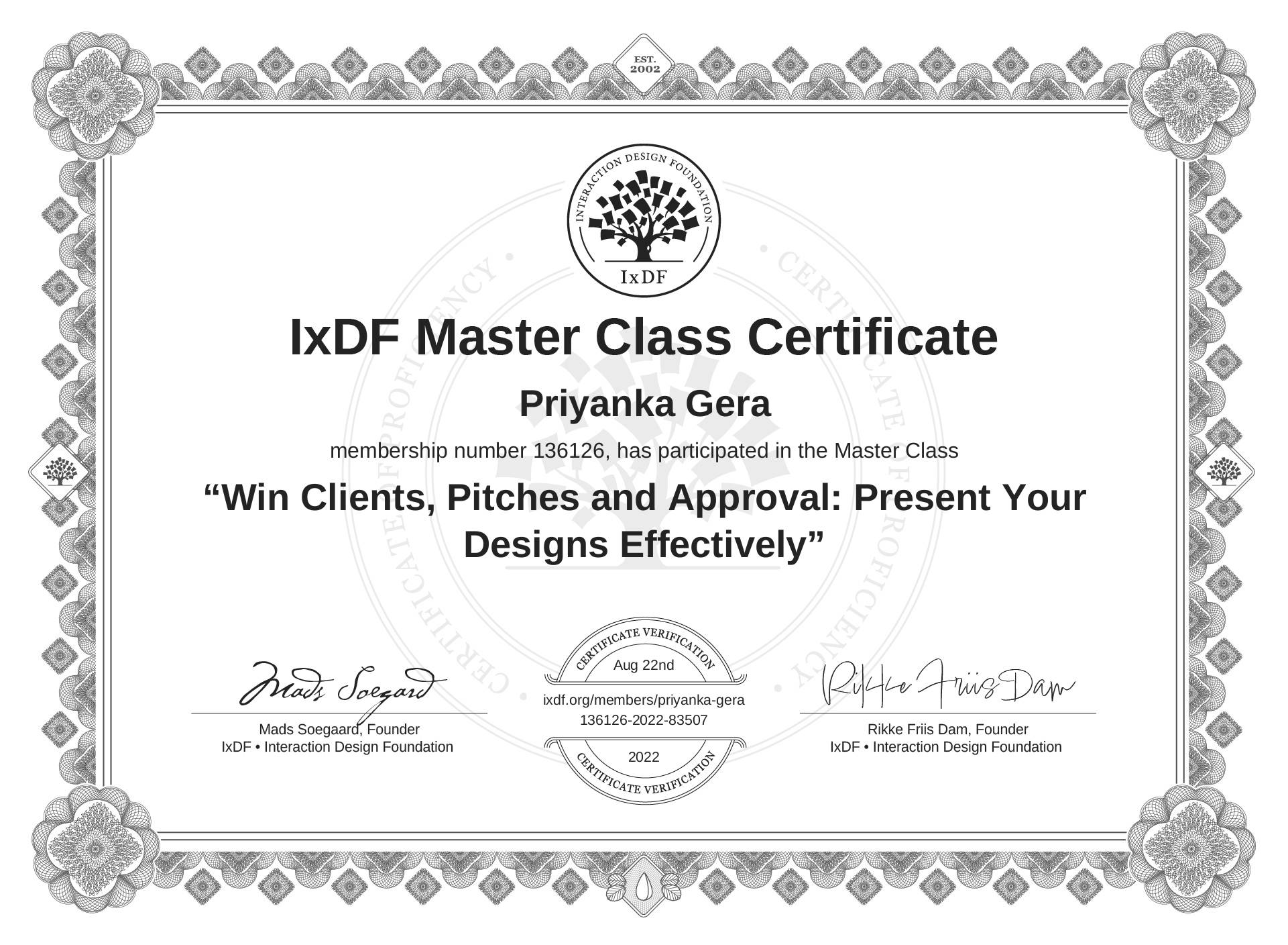 IxDF Master Class Certificates are awarded to Priyanka Gera in formal recognition of their attendance and ongoing commitment to learning from industry leaders.