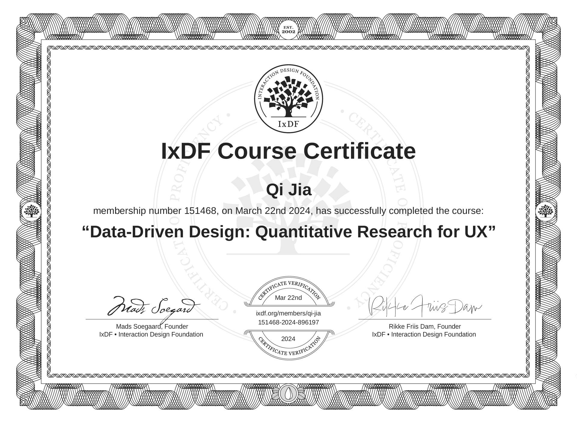 IxDF Course Certificates are awarded to Qi Jia in formal recognition of their coursework surpassing the rigorous benchmarks of exceptional performance established by the IxDF Educational Codex.