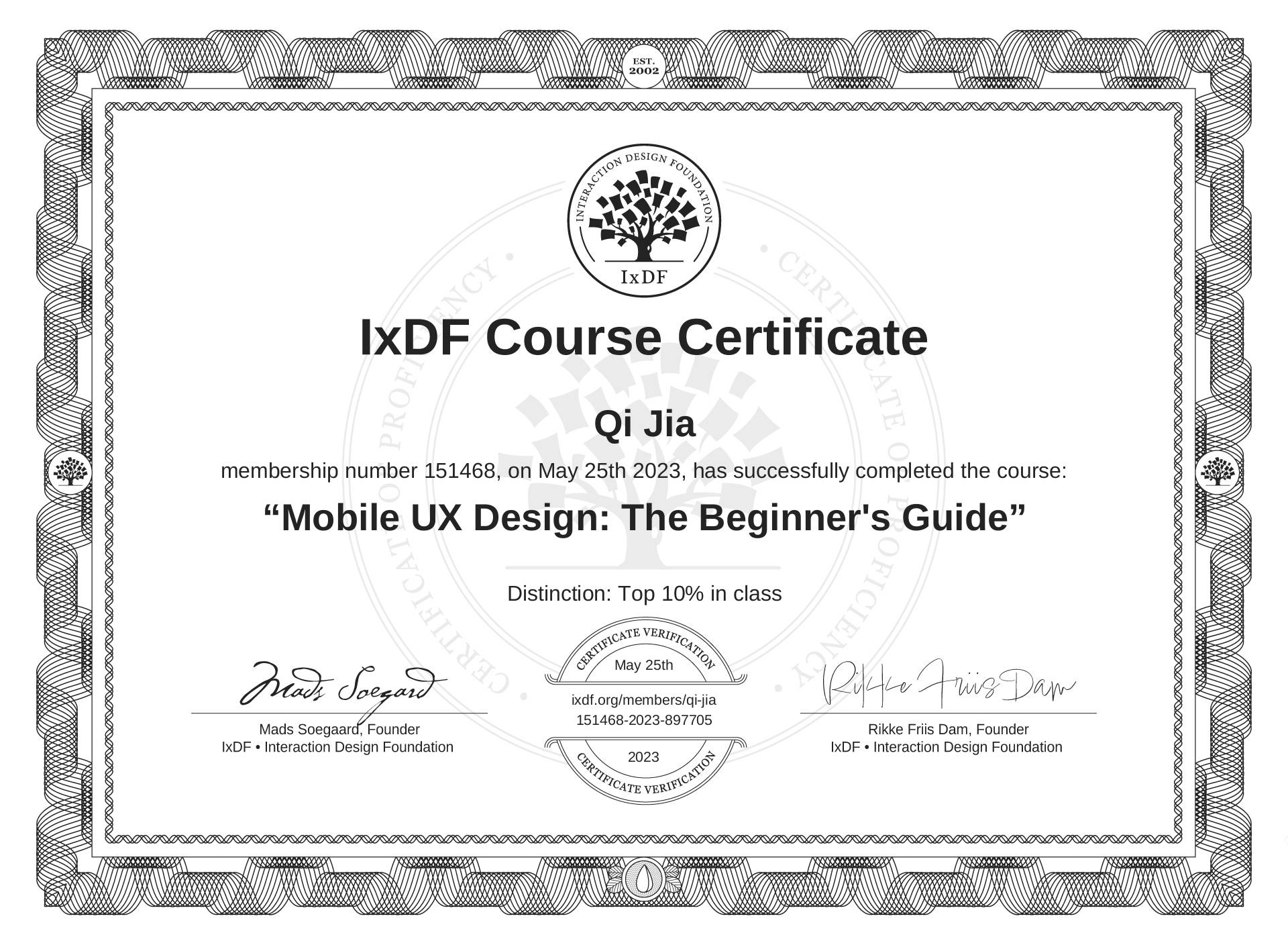 The IxDF Course Certificate (ID #2a15be56-6ef6-429e-a525-72d532a62ef7) above is awarded to Qi Jia with a Top 10% Distinction in formal recognition of their coursework surpassing the rigorous benchmarks of exceptional performance established by the IxDF Educational Codex. View Course Curriculum.