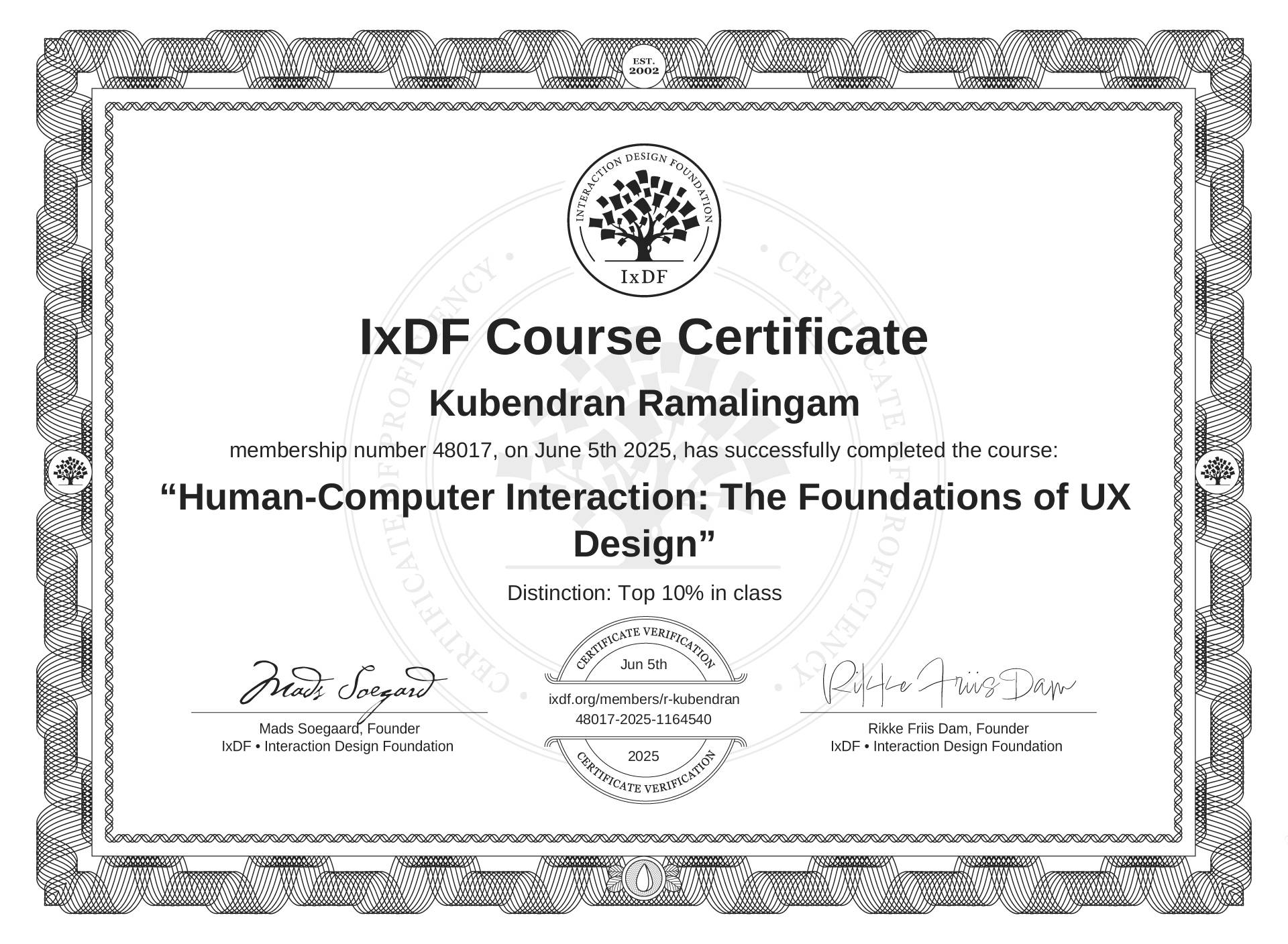 The IxDF Course Certificate (ID #2ce9da4d-af01-440d-9c0b-b79871639455) above is awarded to Kubendran Ramalingam with a Top 10% Distinction in formal recognition of their coursework surpassing the rigorous benchmarks of exceptional performance established by the IxDF Educational Codex. View Course Curriculum.