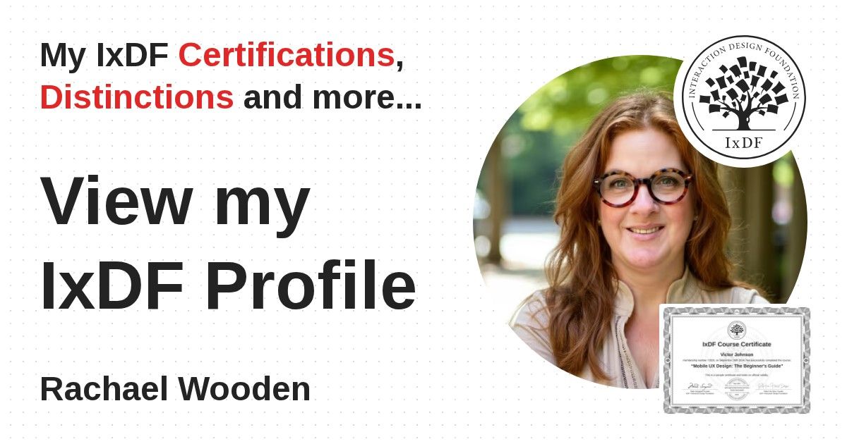 IxDF Course Certificates are awarded to Rachael Wooden in formal recognition of their coursework surpassing the rigorous benchmarks of exceptional performance established by the IxDF Educational Codex.