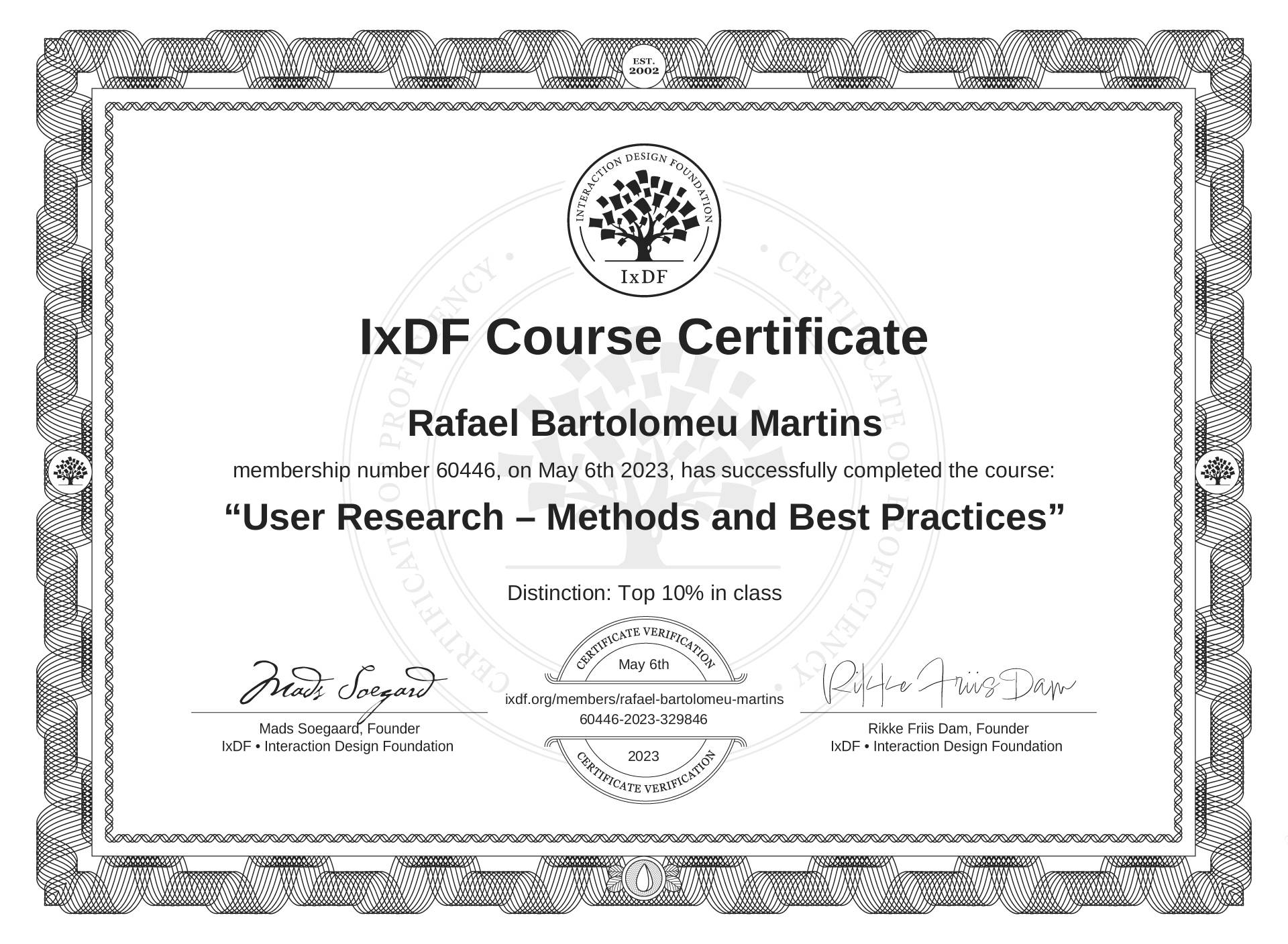 The IxDF Course Certificate (ID #2bb6a494-994f-4302-901d-2679c66179e5) above is awarded to Rafael Bartolomeu Martins