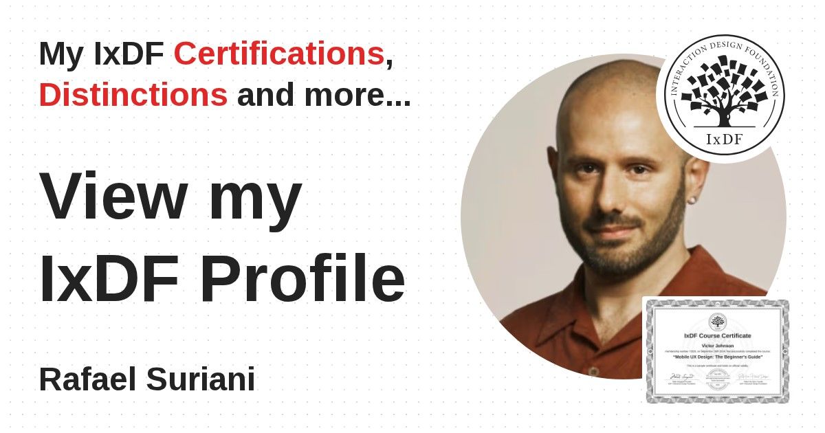 IxDF Course Certificates are awarded to Rafael Suriani in formal recognition of their coursework surpassing the rigorous benchmarks of exceptional performance established by the IxDF Educational Codex.