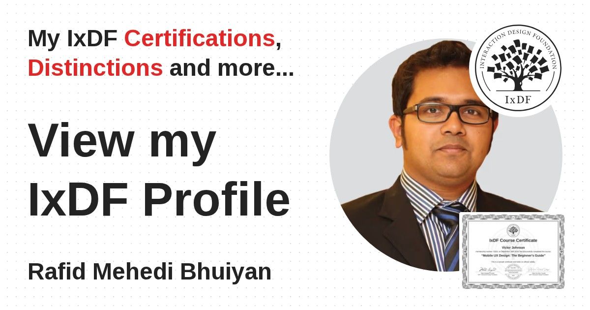 IxDF Course Certificates are awarded to Rafid Mehedi Bhuiyan in formal recognition of their coursework surpassing the rigorous benchmarks of exceptional performance established by the IxDF Educational Codex.