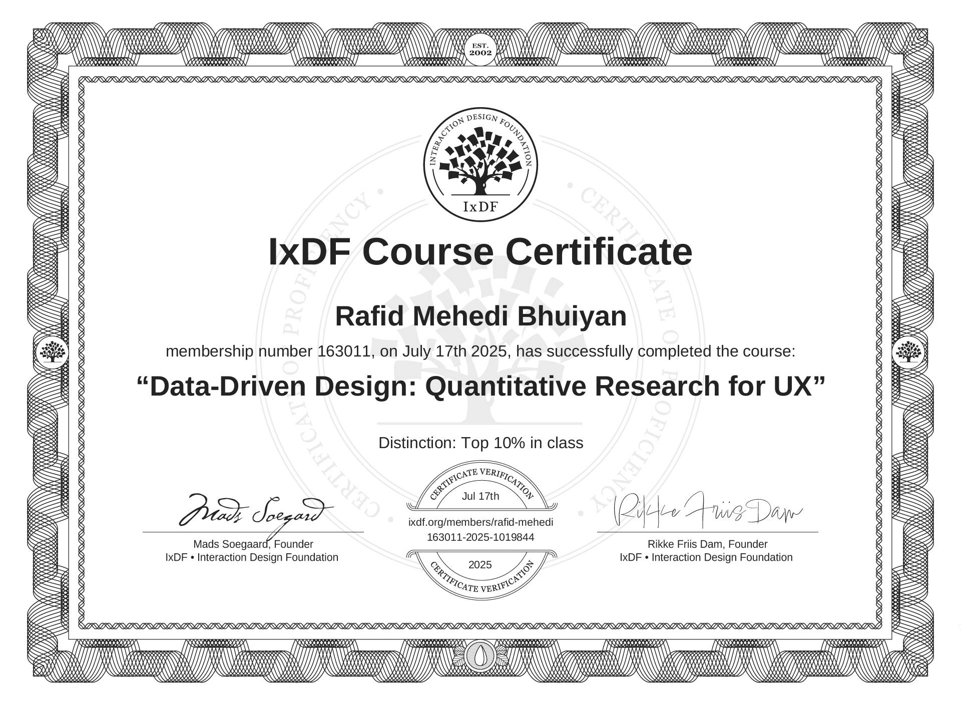 IxDF Course Certificate awarded to Rafid Mehedi Bhuiyan for completing the "Data-Driven Design: Quantitative Research for UX" course