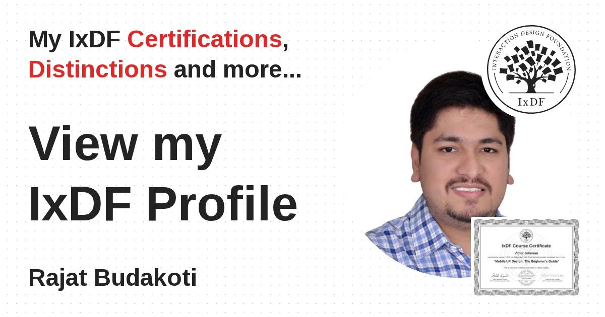 IxDF Course Certificates are awarded to Rajat Budakoti in formal recognition of their coursework surpassing the rigorous benchmarks of exceptional performance established by the IxDF Educational Codex.