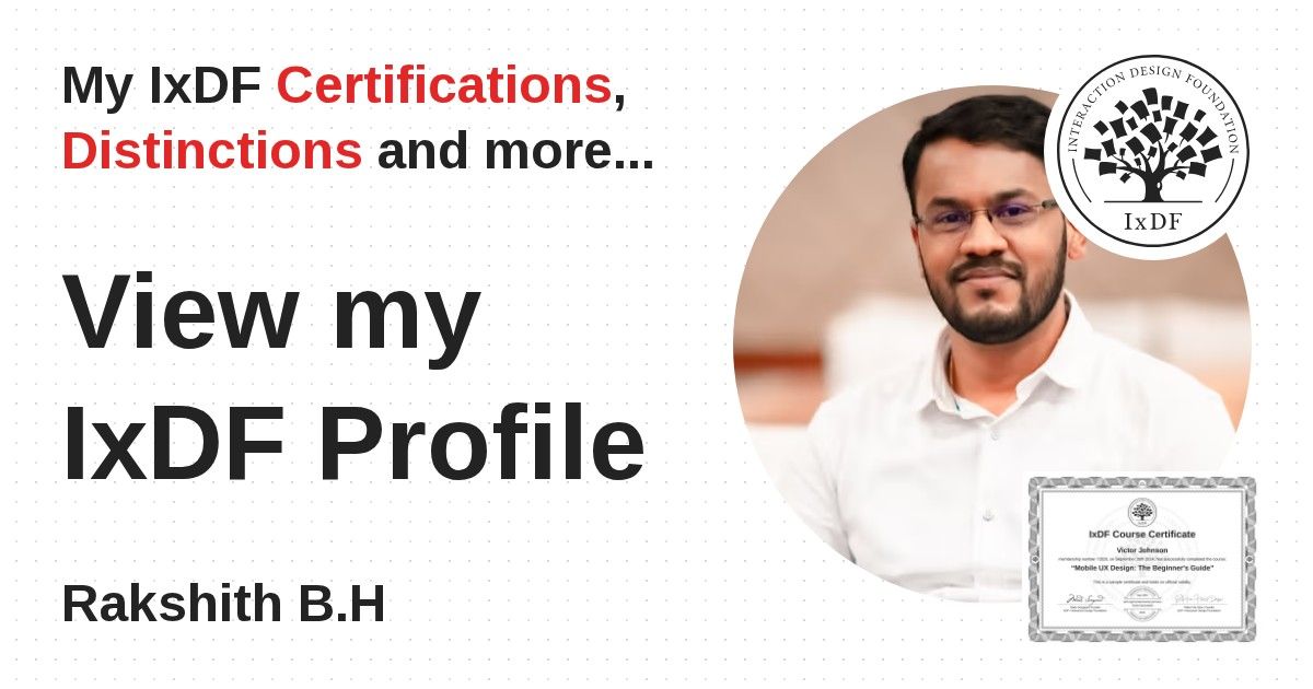 IxDF Course Certificates are awarded to Rakshith B.H in formal recognition of their coursework surpassing the rigorous benchmarks of exceptional performance established by the IxDF Educational Codex.