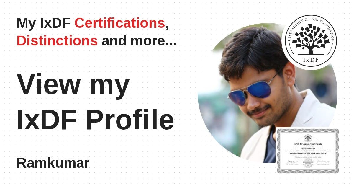 IxDF Course Certificates are awarded to Ramkumar in formal recognition of their coursework surpassing the rigorous benchmarks of exceptional performance established by the IxDF Educational Codex.