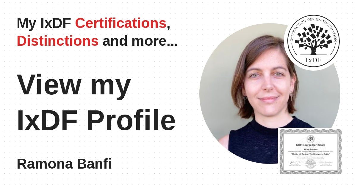 IxDF Course Certificates are awarded to Ramona Banfi in formal recognition of their coursework surpassing the rigorous benchmarks of exceptional performance established by the IxDF Educational Codex.