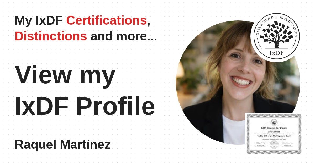IxDF Course Certificates are awarded to Raquel Martínez in formal recognition of their coursework surpassing the rigorous benchmarks of exceptional performance established by the IxDF Educational Codex.