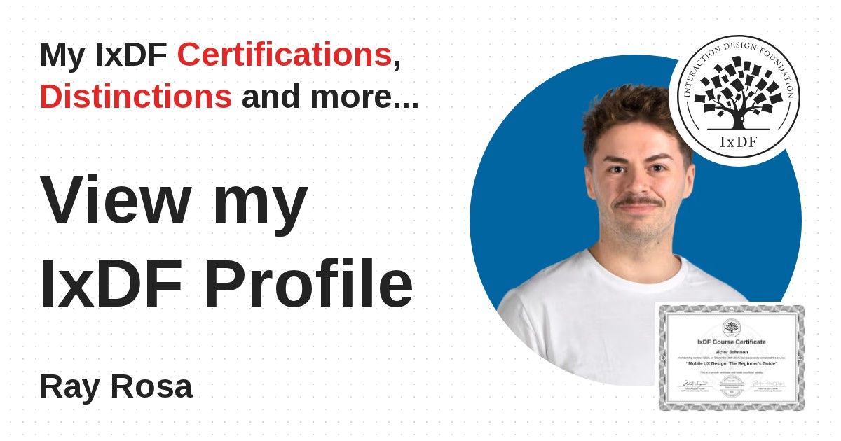 IxDF Course Certificates are awarded to Ray Rosa in formal recognition of their coursework surpassing the rigorous benchmarks of exceptional performance established by the IxDF Educational Codex.