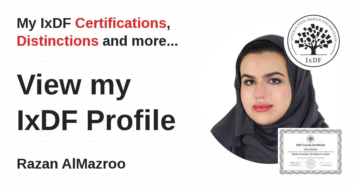 IxDF Course Certificates are awarded to Razan AlMazroo in formal recognition of their coursework surpassing the rigorous benchmarks of exceptional performance established by the IxDF Educational Codex.