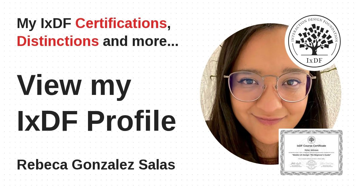 IxDF Course Certificates are awarded to Rebeca Gonzalez Salas in formal recognition of their coursework surpassing the rigorous benchmarks of exceptional performance established by the IxDF Educational Codex.