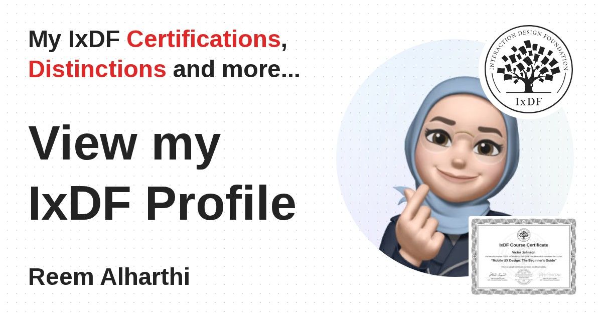 IxDF Course Certificates are awarded to Reem Alharthi in formal recognition of their coursework surpassing the rigorous benchmarks of exceptional performance established by the IxDF Educational Codex.