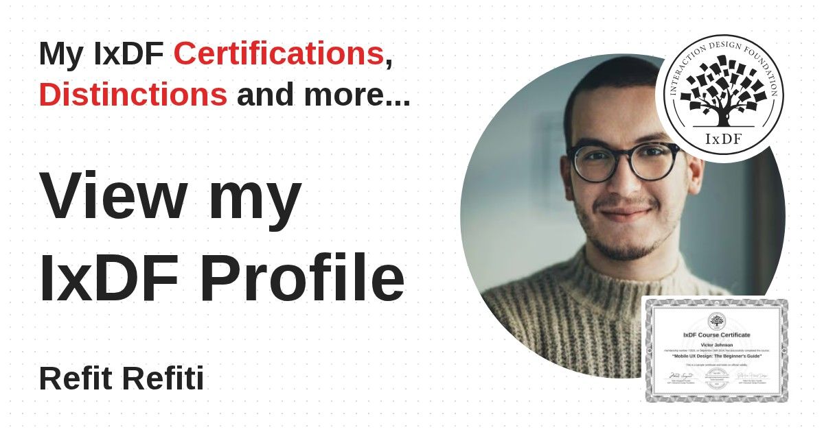 IxDF Course Certificates are awarded to Refit Refiti in formal recognition of their coursework surpassing the rigorous benchmarks of exceptional performance established by the IxDF Educational Codex.