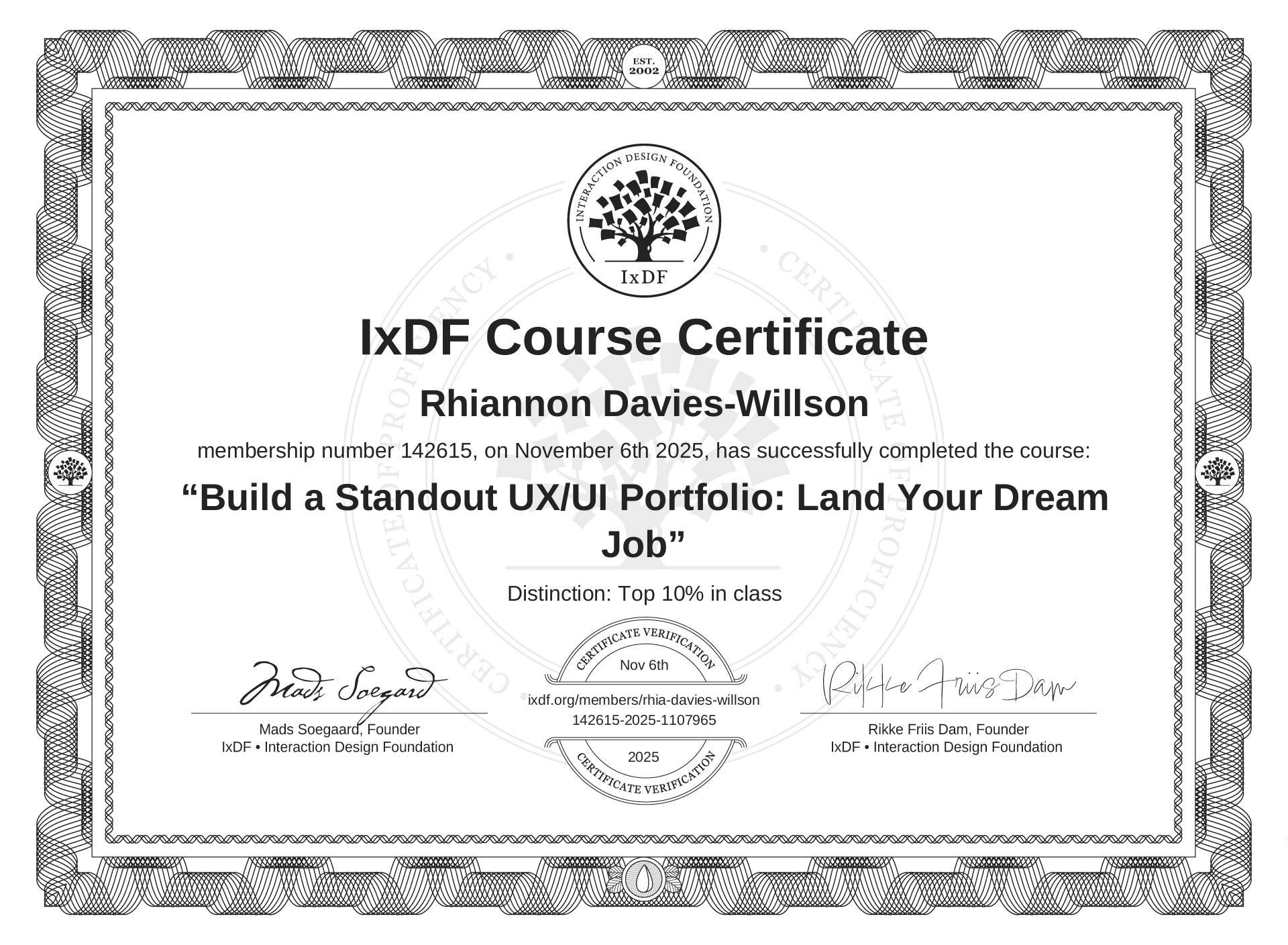 The IxDF Course Certificate (ID #8244934d-88e7-4816-b232-e831dc2df55a) above is awarded to Rhiannon Davies-Willson with a Top 10% Distinction in formal recognition of their coursework surpassing the rigorous benchmarks of exceptional performance established by the IxDF Educational Codex. View Course Curriculum.