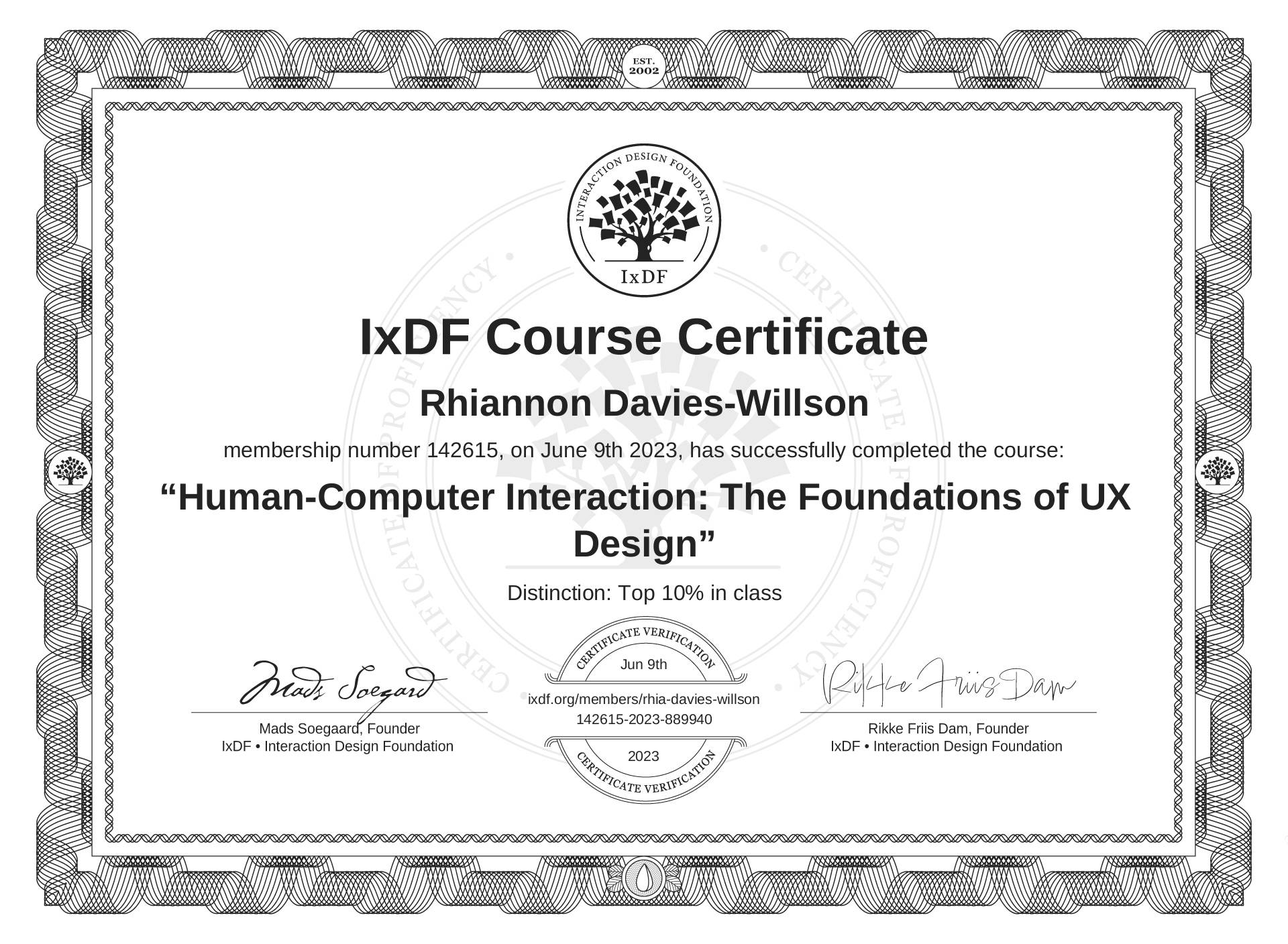 The IxDF Course Certificate (ID #fd21f7e2-3d8d-4457-86e9-47b9c3df7bcd) above is awarded to Rhiannon Davies-Willson with a Top 10% Distinction in formal recognition of their coursework surpassing the rigorous benchmarks of exceptional performance established by the IxDF Educational Codex. View Course Curriculum.