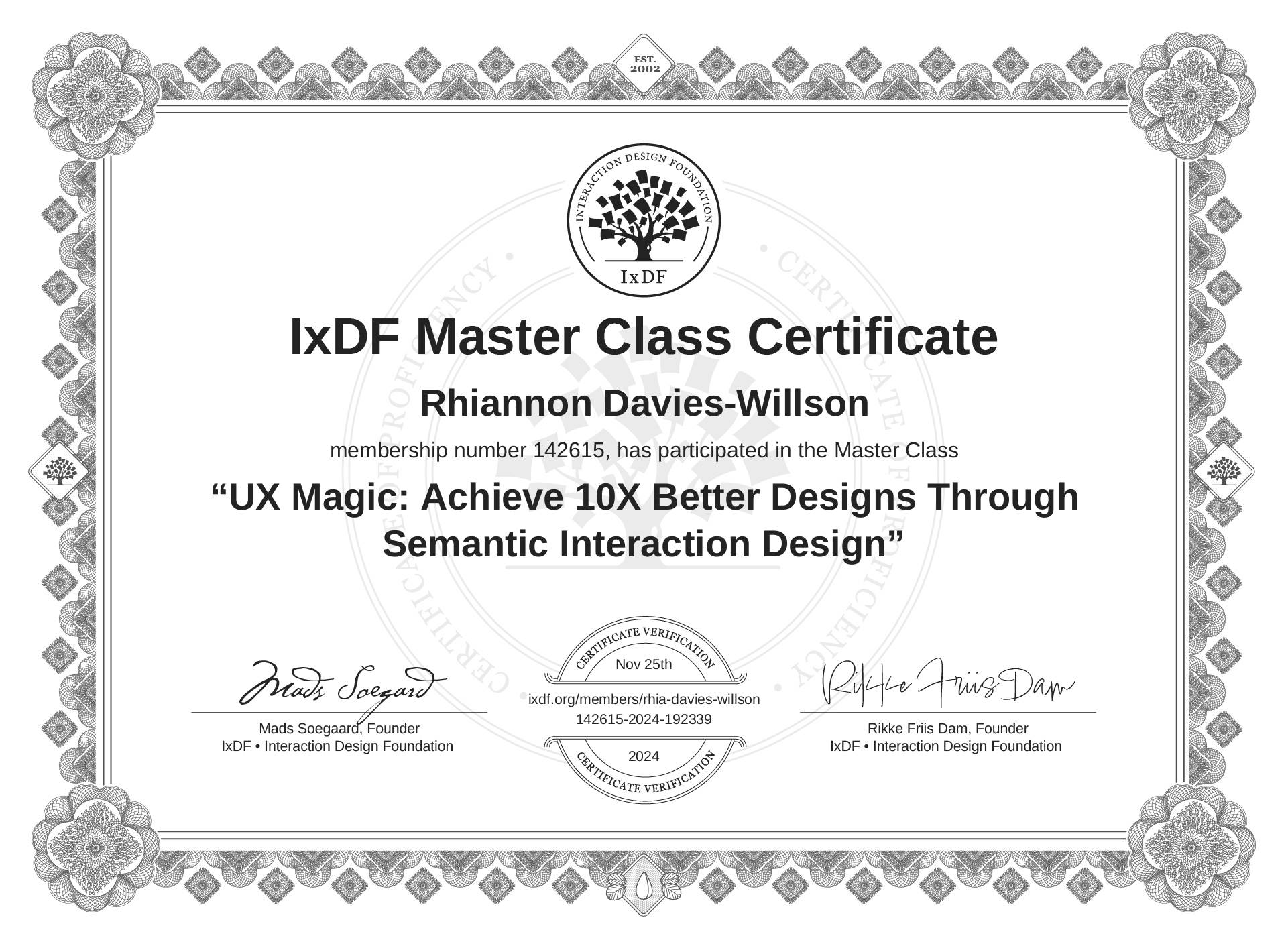 The IxDF Master Class Certificate (ID #mcc_e38e4473972645dda206ebb2055ab49a) above is awarded to Rhiannon Davies-Willson in formal recognition of their participation in the Master Class UX Magic: Achieve 10X Better Designs Through Semantic Interaction Design .