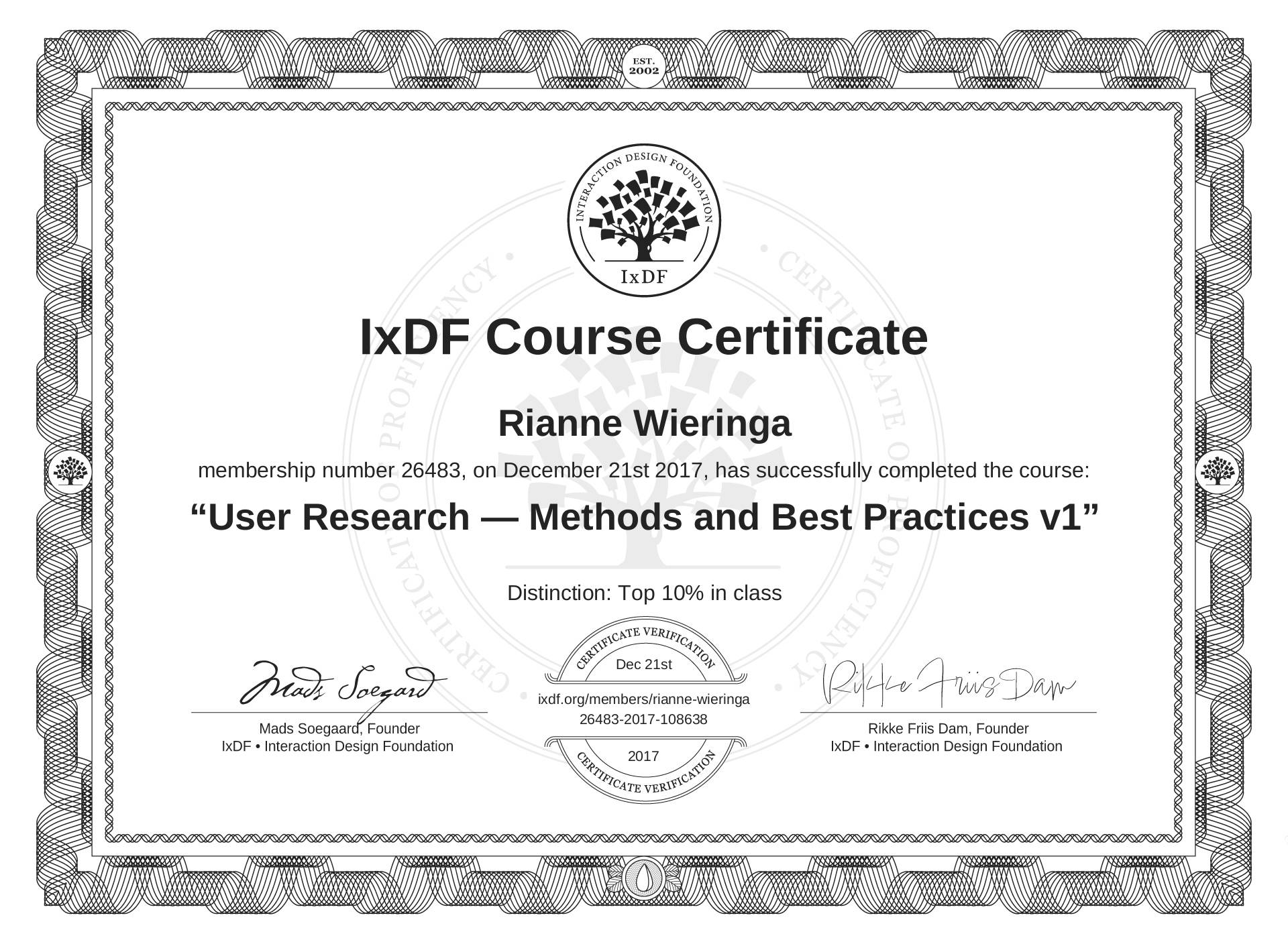 The IxDF Course Certificate (ID #NCQl2hfz9) above is awarded to Rianne Wieringa