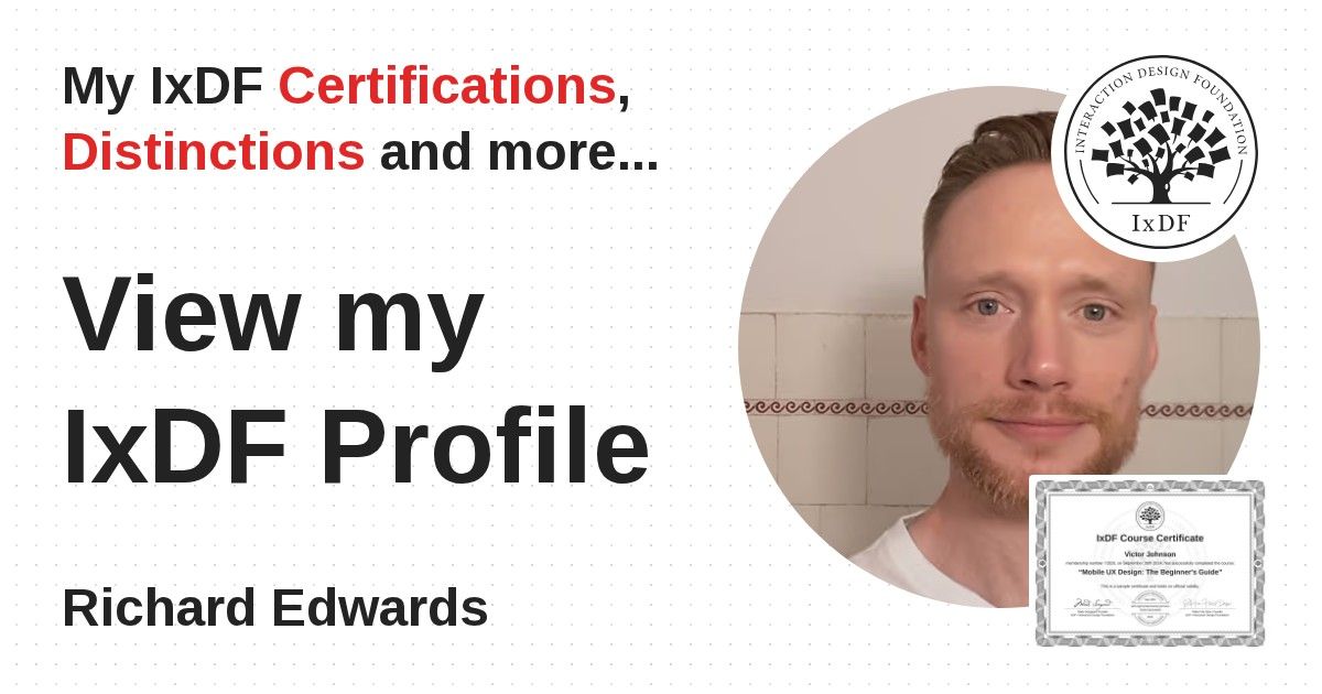 IxDF Course Certificates are awarded to Richard Edwards in formal recognition of their coursework surpassing the rigorous benchmarks of exceptional performance established by the IxDF Educational Codex.