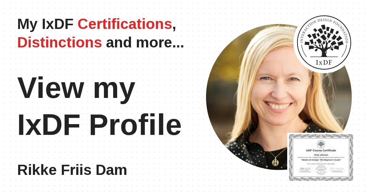 IxDF Course Certificates are awarded to Rikke Friis Dam in formal recognition of their coursework surpassing the rigorous benchmarks of exceptional performance established by the IxDF Educational Codex.