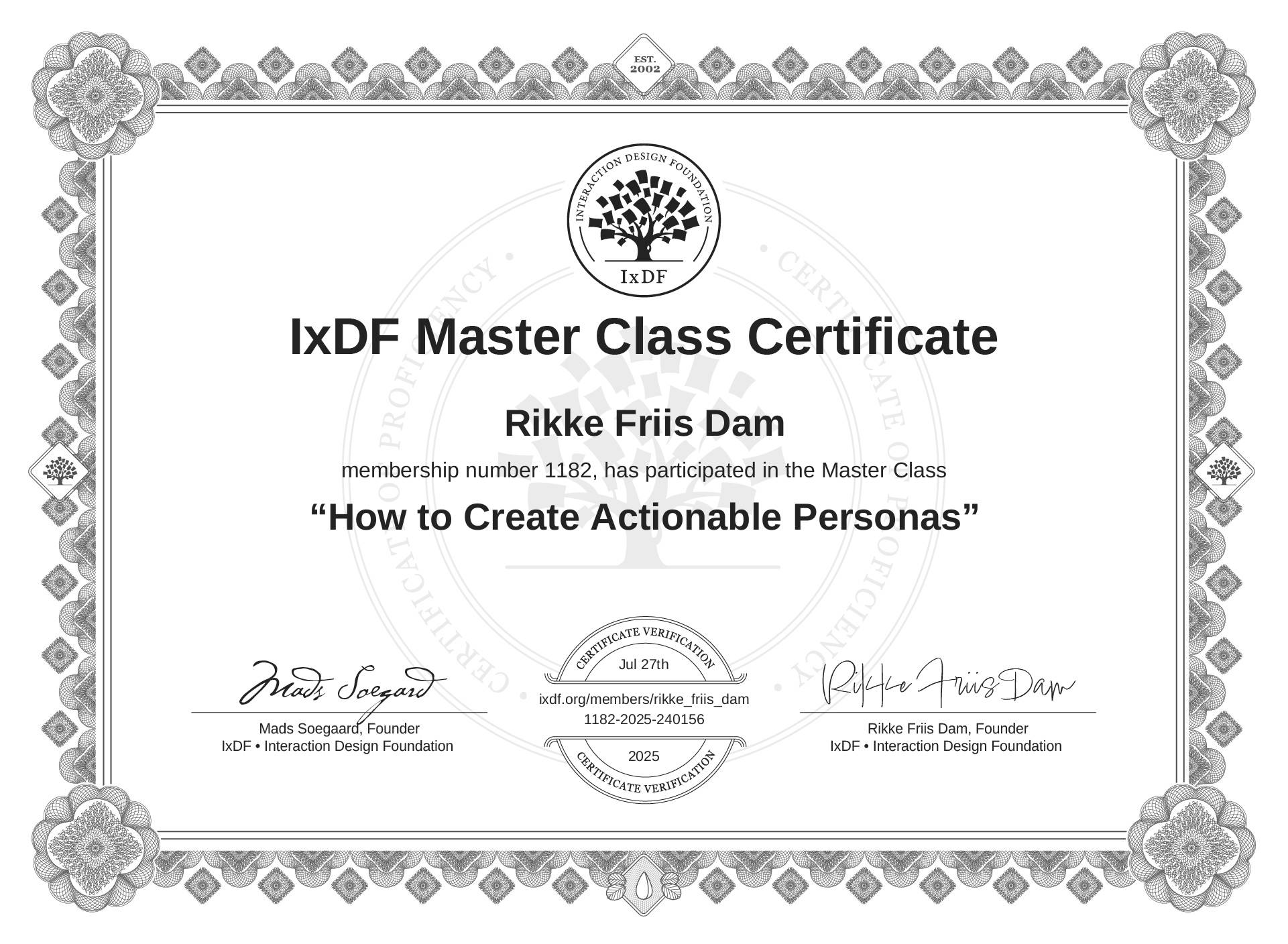 IxDF Master Class Certificates are awarded to Rikke Friis Dam in formal recognition of their attendance and ongoing commitment to learning from industry leaders.