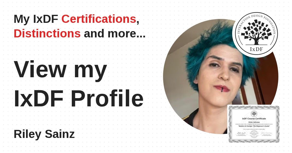 IxDF Course Certificates are awarded to Riley Sainz in formal recognition of their coursework surpassing the rigorous benchmarks of exceptional performance established by the IxDF Educational Codex.