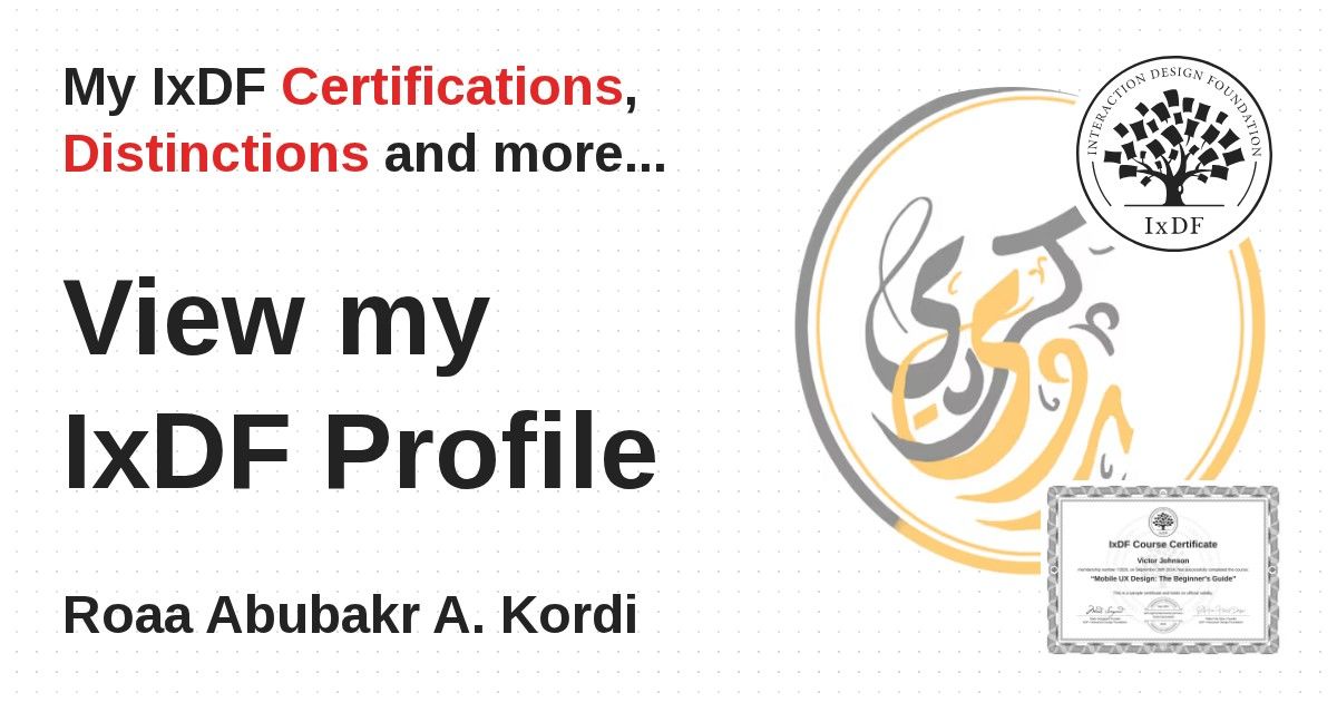 IxDF Course Certificates are awarded to Roaa Abubakr A. Kordi in formal recognition of their coursework surpassing the rigorous benchmarks of exceptional performance established by the IxDF Educational Codex.