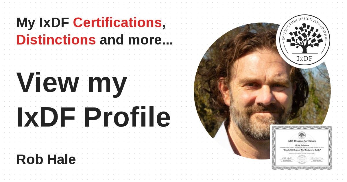 IxDF Course Certificates are awarded to Rob Hale in formal recognition of their coursework surpassing the rigorous benchmarks of exceptional performance established by the IxDF Educational Codex.